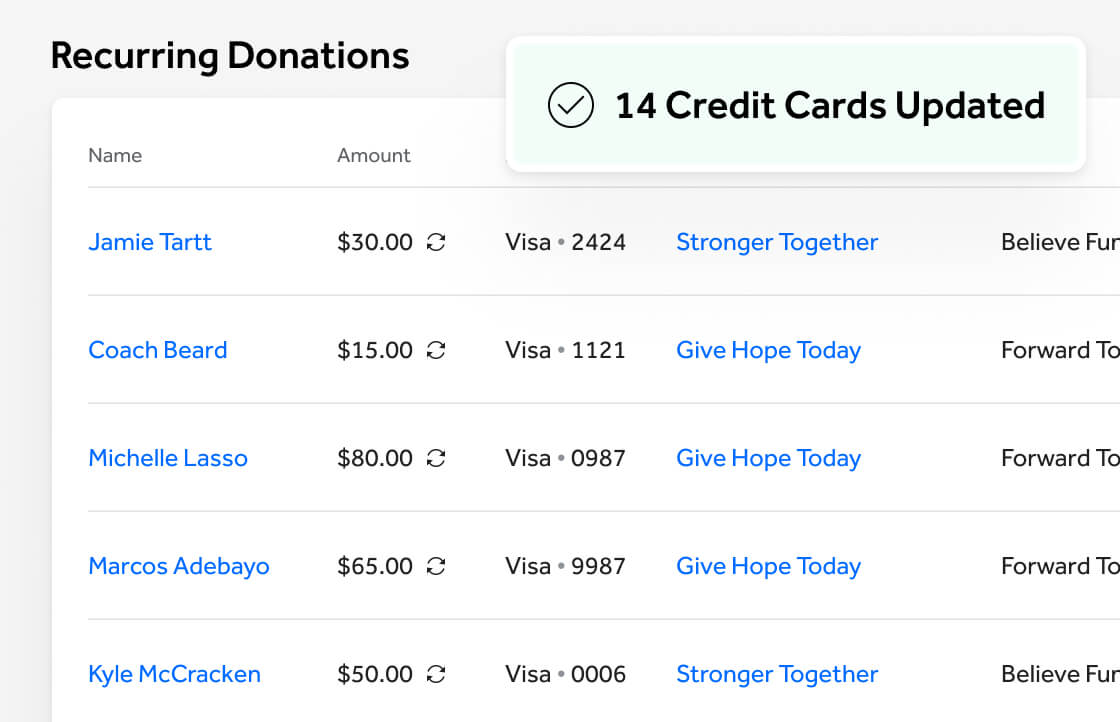 Automatically update expired or canceled cards with new payment information to avoid lapsed recurring donations. It's like magic!